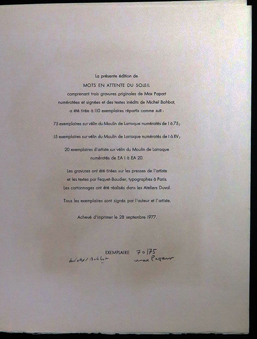 each numbered 70/75 (total edition includes 20 proofs), As published by Vision Novelle, Paris; printed by Fequet-Baudier, typographers, Paris