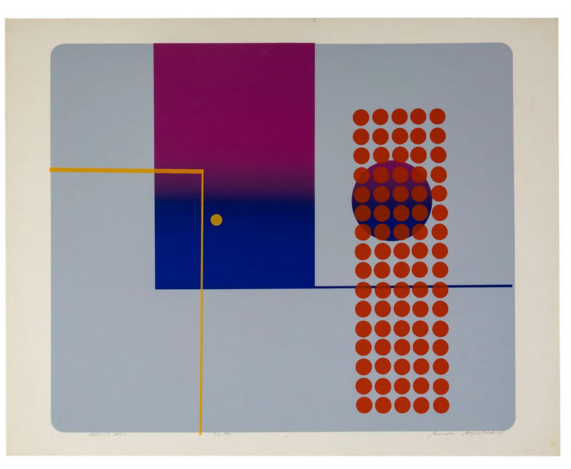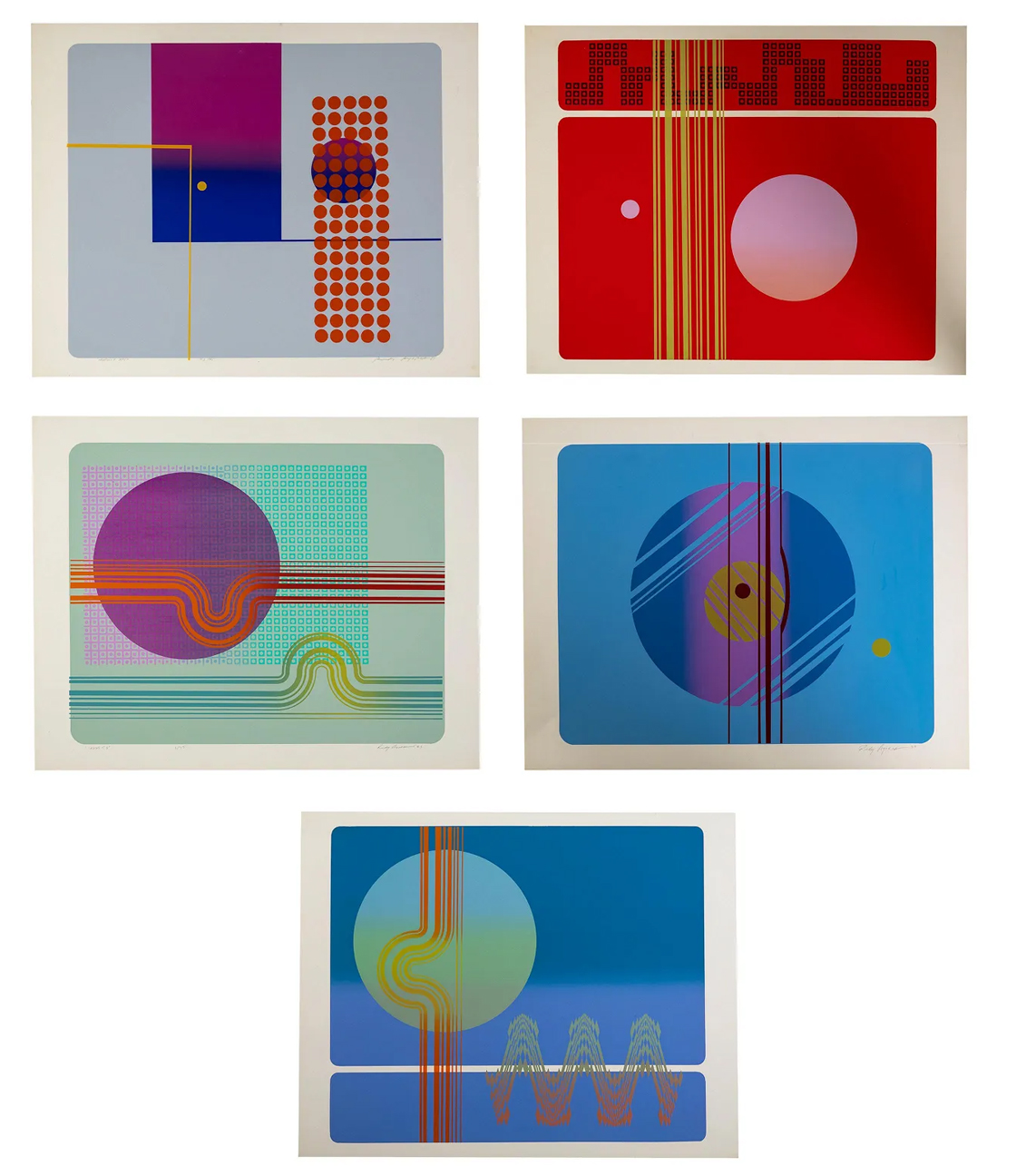 - Note: Collection of five color kinetic, geometric composition serigraphs, three signed. One image titled "Dignity" lower left, numbed 23/45 lower left center, and signed and dated 8? in pencil by artist lower right. One image title "Cosmos 56" lower left, numbered 3/45 lower left center, and signed and dated 1983 inpencil by artist in lower right, a third image untitled, signed and dated 1983 inpencil by artist in lower right, and and two unsigned Rudy Ayoroa color serigraphs, trial proofs, probably never editioned. Each serigraph measures approximately 22 5/8 in. x 28 5/8 in. Original backing, since discarded, stamped "Rudy Ayoroa, Visual Artist, Paintings and Kinetic Constructions".